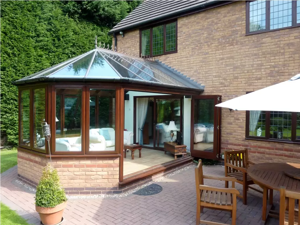 This timber conservatory in Stafford has been rebuilt by Traditional Conservatories onto an existing base with timber bi folding doors to the side.
